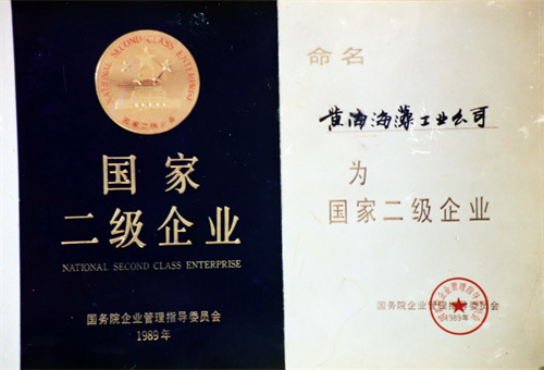 1989年,黃海海藻工業公司被評為國家二級企業,是當時國內的海藻綜合性加工企業。