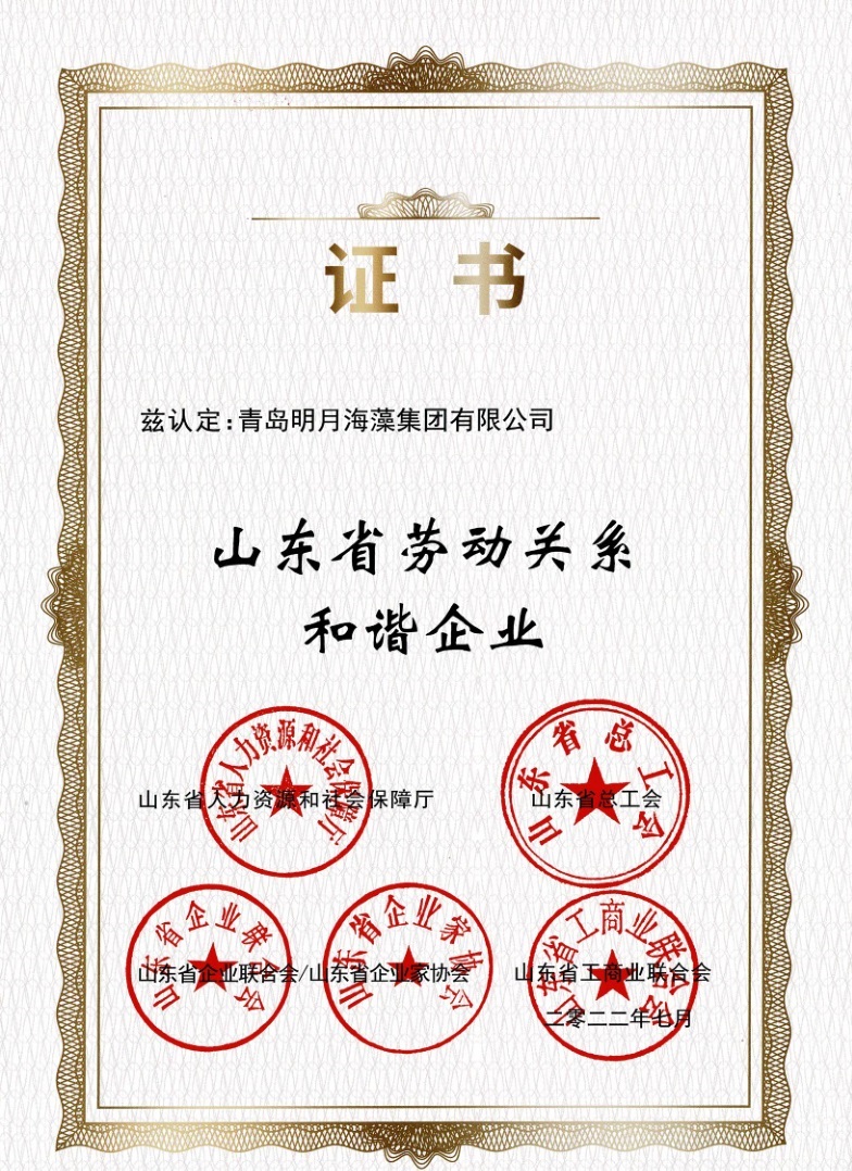 4月27日 明月海藻集團獲評"山東省勞動關系和諧企業"。并授牌。